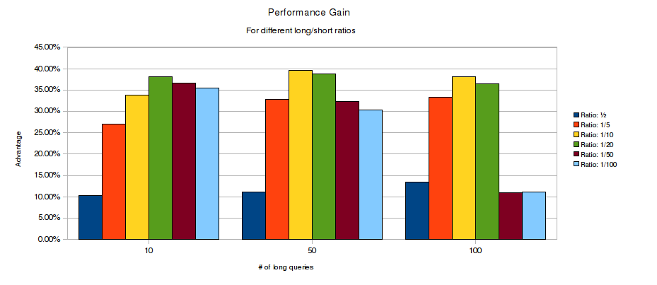 I tested for 10, 50 and 100 long queries with the following multipliers (1, 2, 5, 10, 50, 100). The graph shows the performance gain for each number of queries vs the multiplier. For example 50 long queries with a multiplier of 10 (i.e. 500 short queries) achieves a 39.6% reduction in query execution time. I have repeated many of the tests several time (not all of them, too lazy to do that). The repeated tests showed consistent results so I am pretty confident of the presented results.