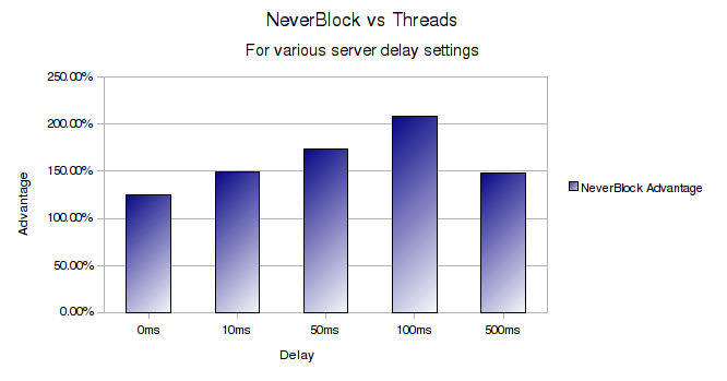 Here is a graph of the NeverBlock advantage over the fastest threaded client