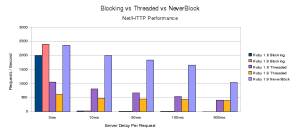 Needless to say, NeverBlock is much ahead of the threaded clients (either 1.8 or 1.9) when working with the zero latency server. We also see that 1.8 threads are considerably faster than 1.9’s.