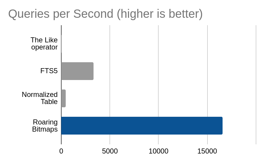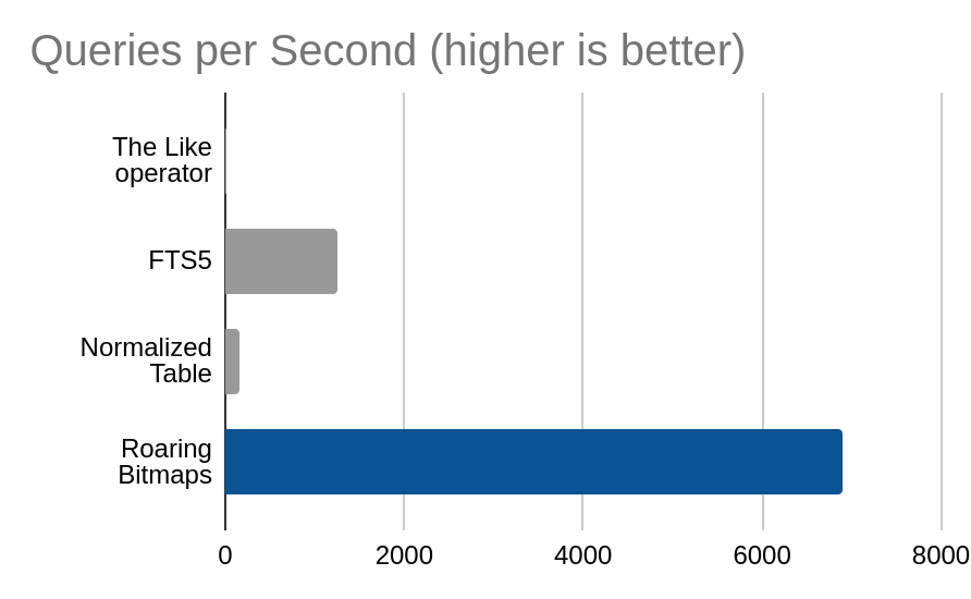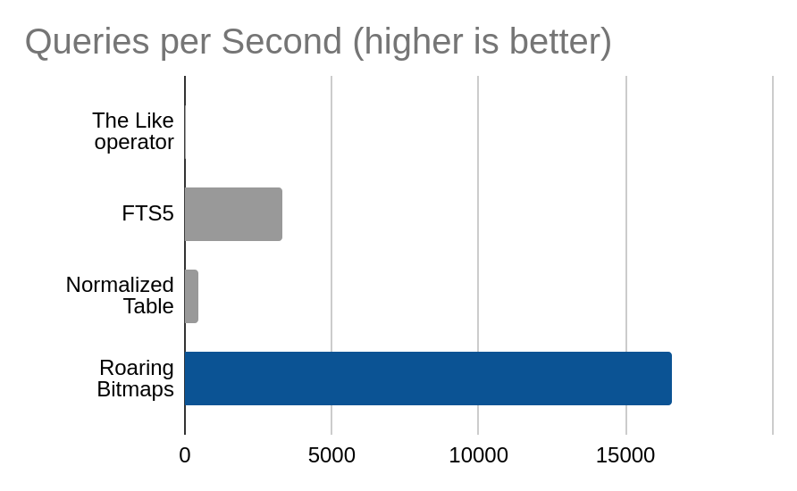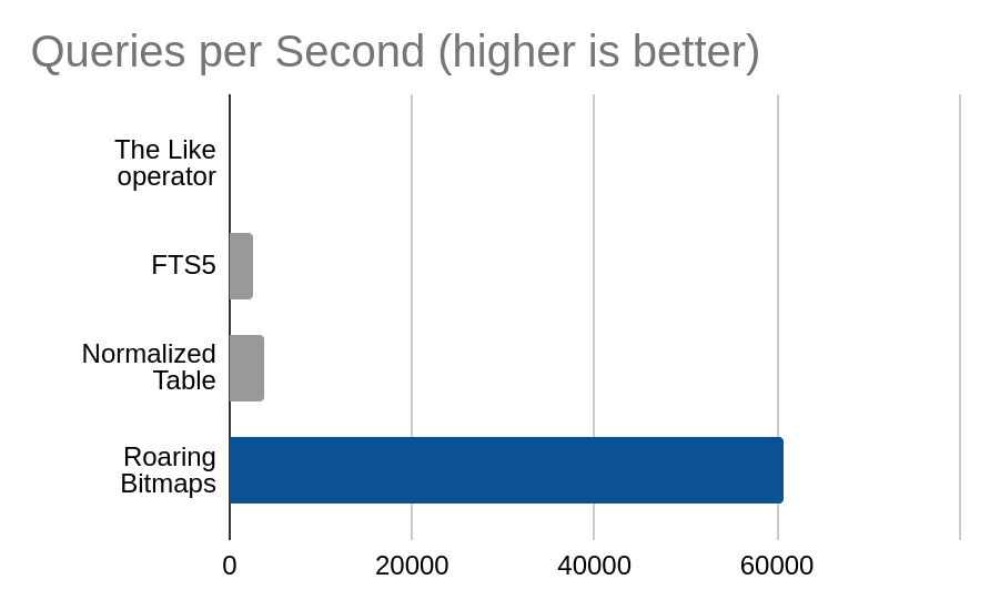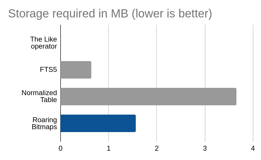 An honorable mention goes to the FTS5 implementation, which manages to hold its own with very little storage overhead and absolutely no reliance of fancy SIMD instructions like roaring bitmaps do.