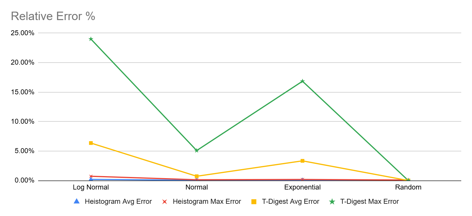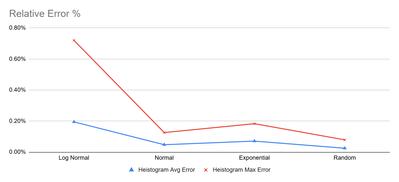 On the other hand Heistogram remained pretty accurate for all the tested percentile, the worst showing was 0.72% (that’s under 1%) error for the p99.999 value of the log-normal data set. Here’s another chart focusing only on Heistogram errors