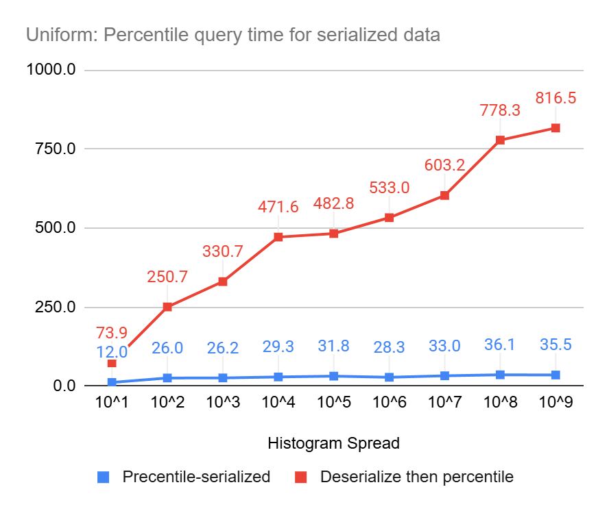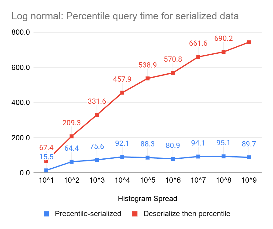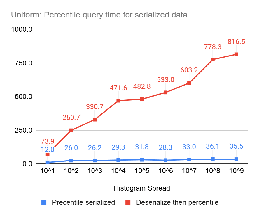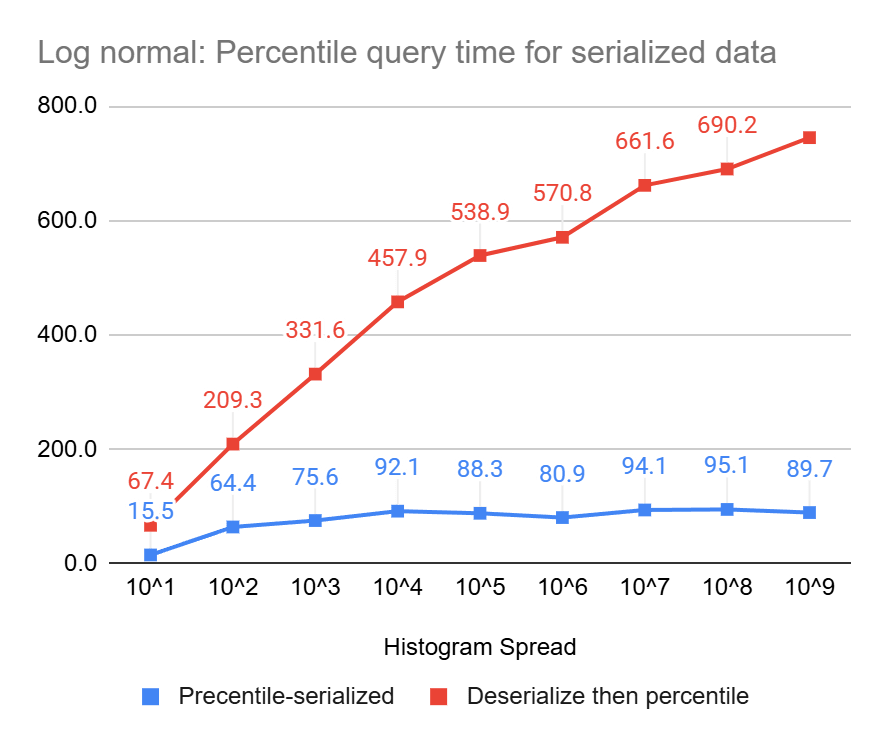 These charts clearly show the power of percentile queries on serialized data, compared to serializing first and then performing the queries, they end up being up to 23 times and 8 times faster, for uniform and log-normal data, respectively.