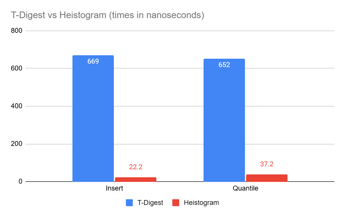 For typical operations, Heistogram is up to 20x faster than T-Digest on similar data sets (10M entries, log-normal distribution). Since Heistogram only supports integer values, the data spread for the test was chosen at 10^9.