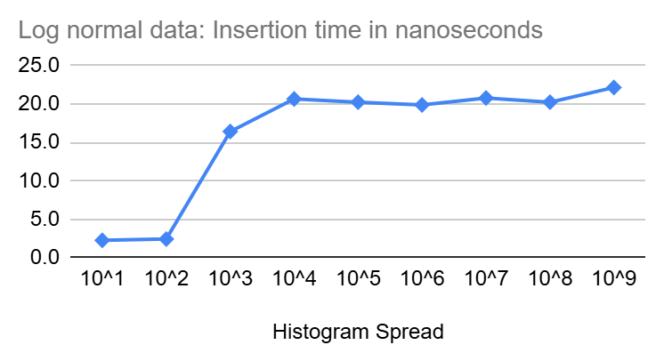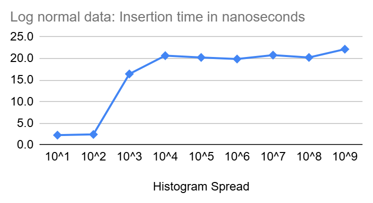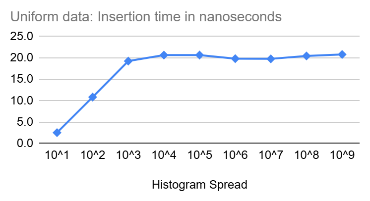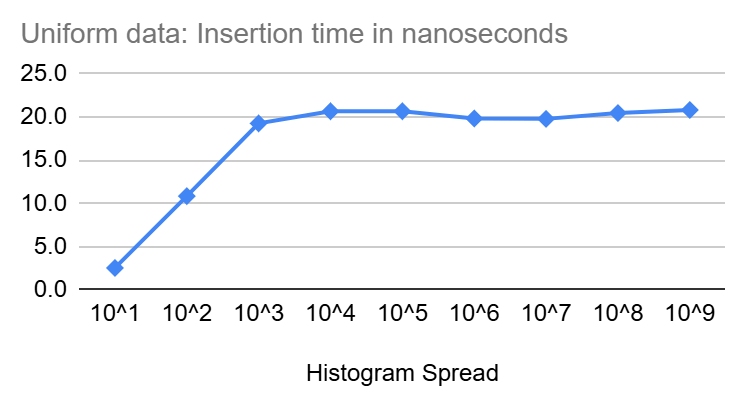 In the diagrams above, we see that inserts start at a few nano seconds for very tight Heistograms then climb quickly to settle around 20 nanoseconds for larger spread.