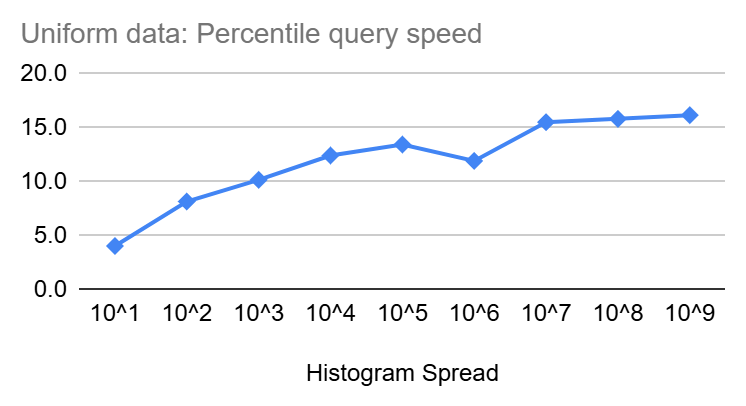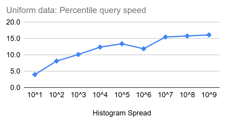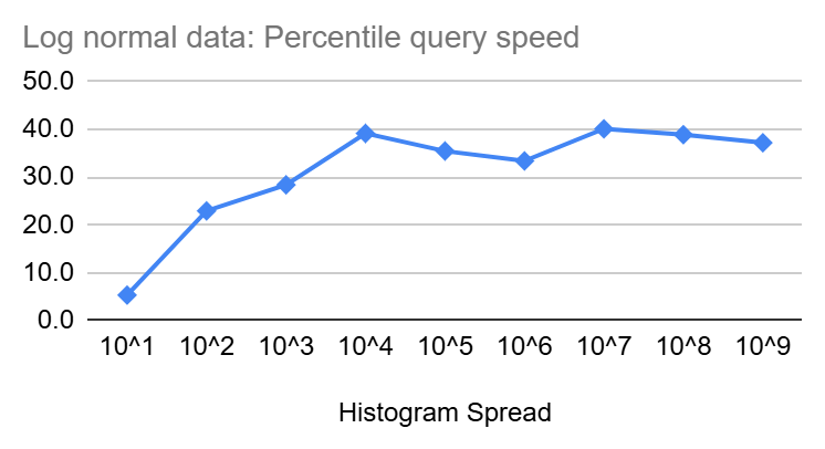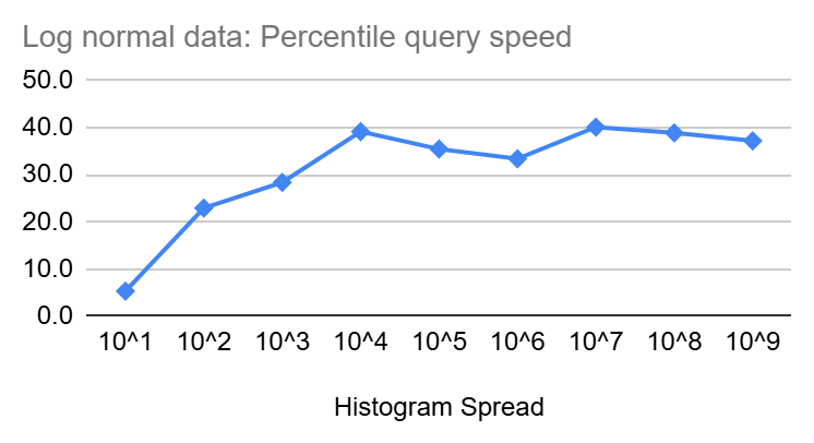 Similar to insertion speed, percentile queries start at a few nanoseconds but then increase slowly in size as the spread of the Heistogram increase until it reaches ~16ns and ~40ns for uniform and log-normal distributions, respectively, at a spread of 10^9. Though the increase is clearly sub-linear and should be increasing with even less steepness as we get closer to the end of the 64 Bit range.